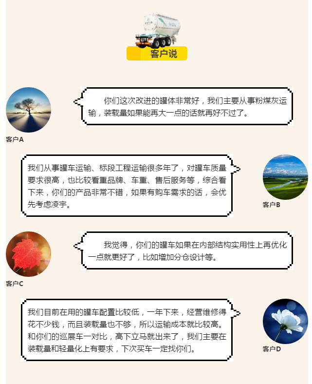 很多客戶表示,他們一直都在關(guān)注凌宇此次的巡展活動。寶雞地區(qū)有客戶經(jīng)營罐車運輸已經(jīng)10多年了,各個品牌的罐車都用過。實地參觀完凌宇罐車后,他們對自重改進、車橋選配等都十分滿意,并且還對短軸距滿足12米地磅的設(shè)計非常感興趣,因為他們主要做標段運輸,路況比較復雜,因此對出灰管路、車輛品質(zhì)等的要求也更高。在看完凌宇粉罐車后,客戶表示出了*的合作意向,希望后續(xù)能展開深度合作。